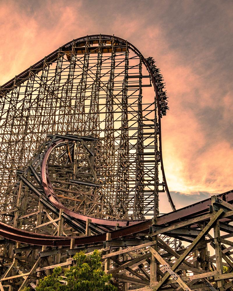 Steel Vengeance flies down its first drop, accompanied by a beautiful sunset in the background.